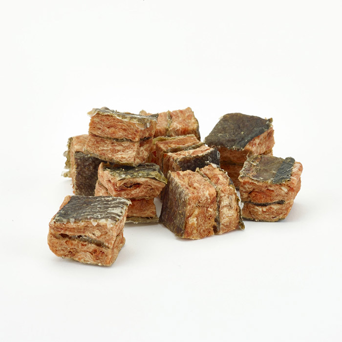 人気のサーモンとホワイトフィッシュの皮を組み合わせた新作トリーツです。