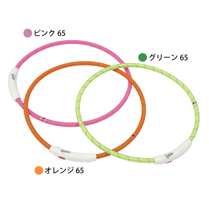 「ループ セイフLEDリング」はゴムのような弾力性とプラスチックのような強度を併せ持つTPUに、表面をナイロン生地で保護した、夜間お散歩用の首にかけるタイプのLEDライトです。