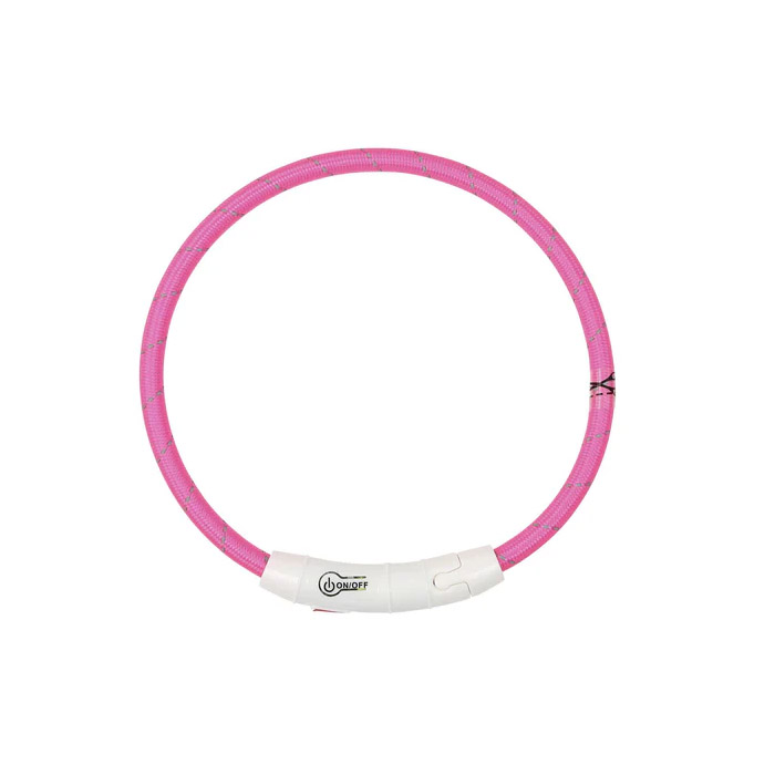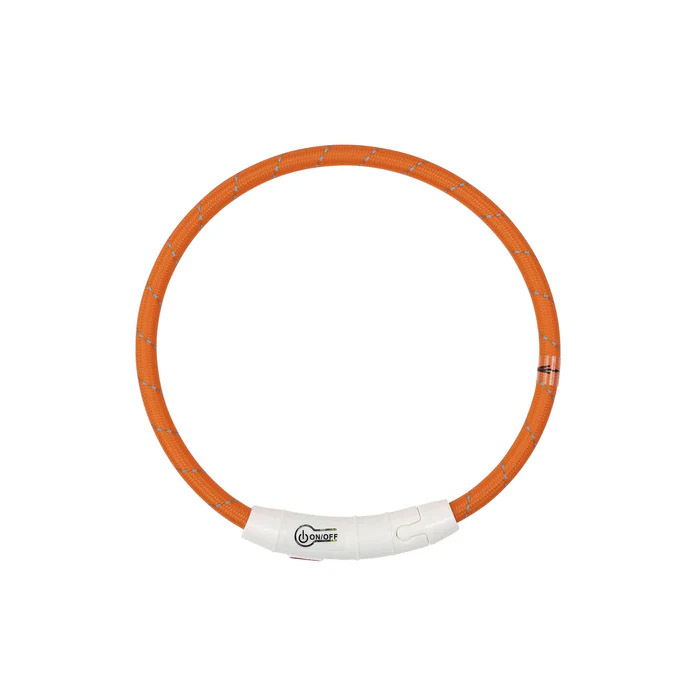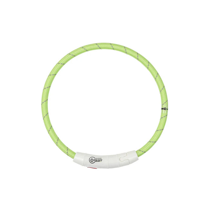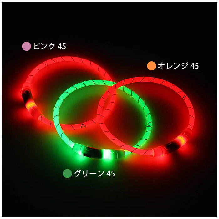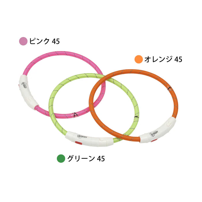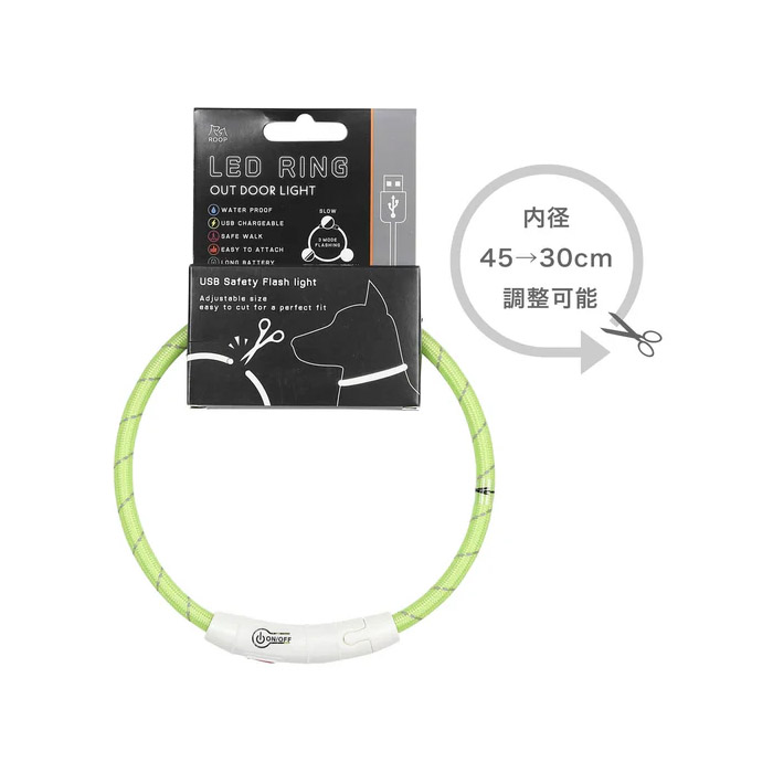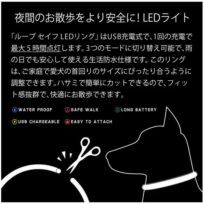 「ループ セイフLEDリング」はゴムのような弾力性とプラスチックのような強度を併せ持つTPUに、表面をナイロン生地で保護した、夜間お散歩用の首にかけるタイプのLEDライトです。