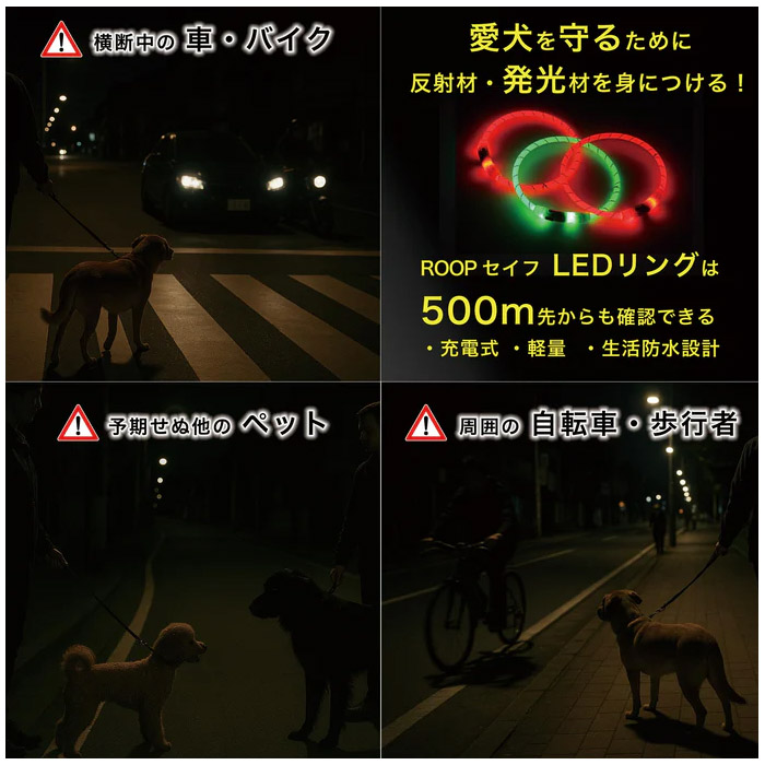 ●500m先からでも目視確認ができる性能があり、暗所でも周囲に広く存在を示すことによりワンちゃんの安全を図ります。