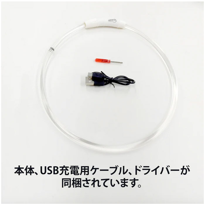 ・水中での使用はできません。水没させないでください。 ・点灯方式、使用頻度、充電時間等、様々な要因により連続使用可能時間は変動します。 ・首輪を調整する場合は、首と首輪の間に指が2本ほど入るくらいの余裕を持たせて下さい。 ・一度に大きく切りすぎず、少しずつ調整するのがおすすめです。 ・カットする際は安全に十分ご注意ください。 |