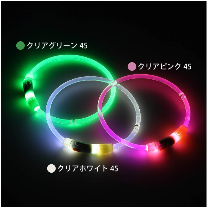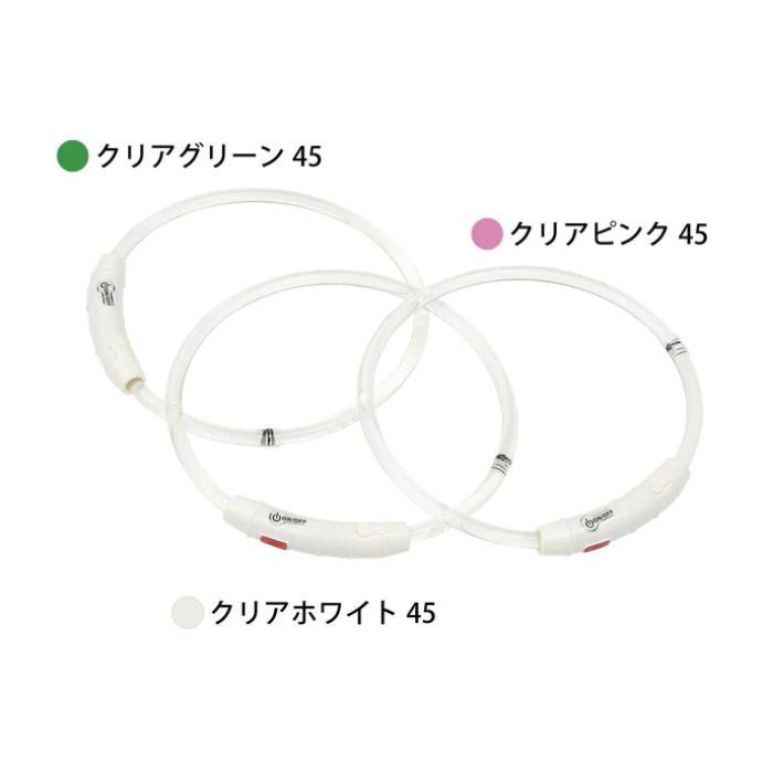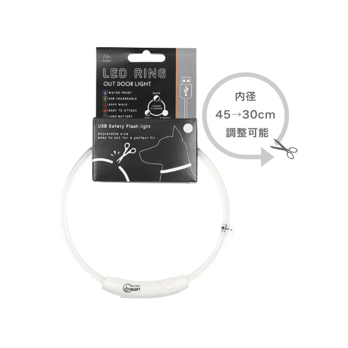 「ループ セイフLEDリング クリア」は、ゴムのような弾力性とプラスチックのような強度を併せ持つTPUでできた夜間お散歩用の首にかけるタイプのLEDライトです。