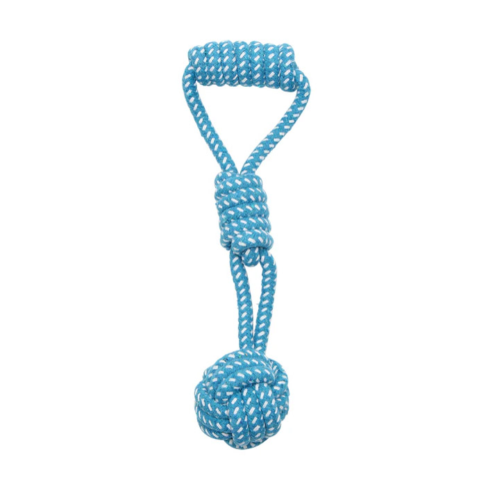 「ノッティー ボールハンドル」は、明るいブルーのロープで編まれたボールにしっかり補強された持ち手が繋がっています。丈夫に編まれているので、噛む・引っ張る・追いかける等、楽しく遊ぶことができ、しっかり噛めるので、ストレス解消やデンタルケアにもってこいです。