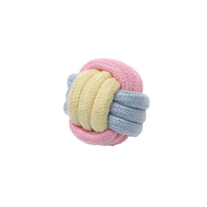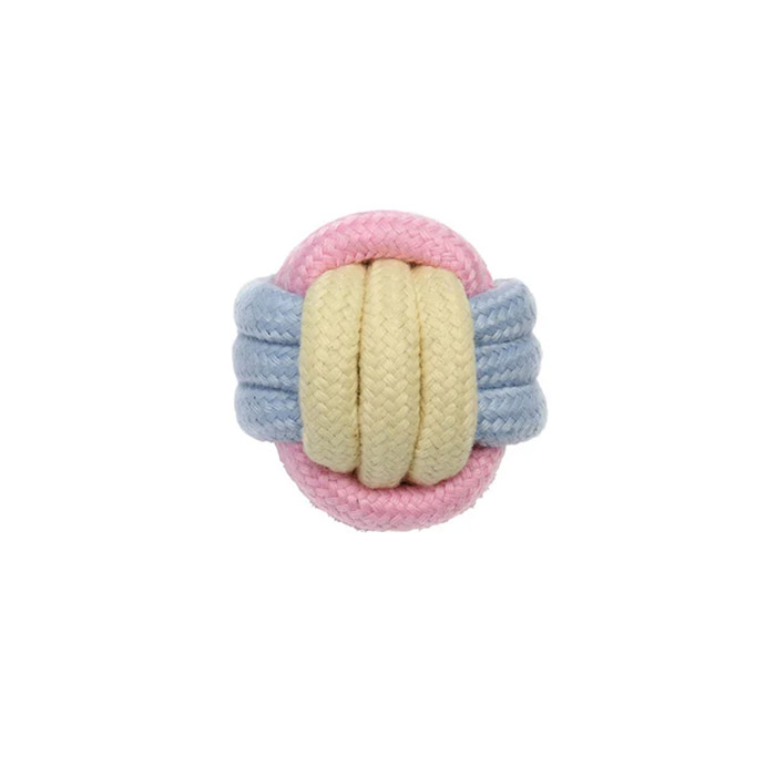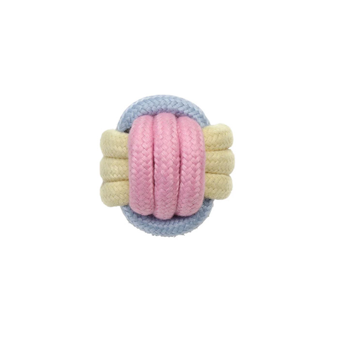 「ノッティー パステルボール」は、伸縮性のある編み方をしたロープをボール状にしたものです。丈夫に編まれているので、噛む・引っ張る・追いかける等、室内外どこでも楽しく遊ぶことができます。お外で遊ぶときは可愛い色合いの「ノッティー パステルボール」で注目の的になること間違いなしです。