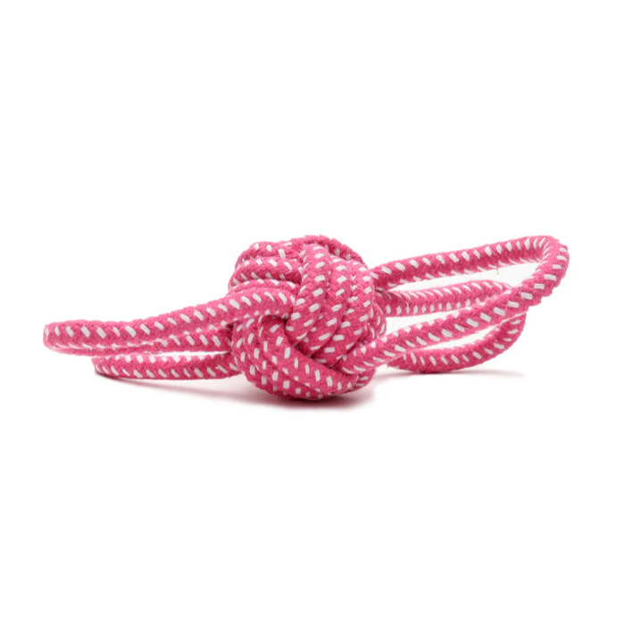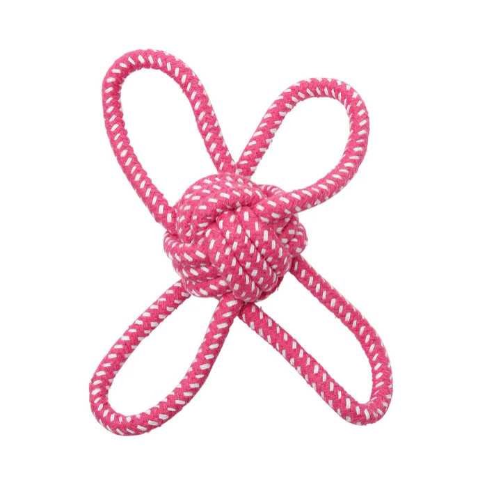 「ノッティー ボール4」は、明るいピンク色のロープで編まれたボールに放射状4つの輪が繋がっています。丈夫に編まれているので、噛む・引っ張る・追いかける等、楽しく遊ぶことができ、しっかり噛めるので、ストレス解消やデンタルケアにもってこいです。