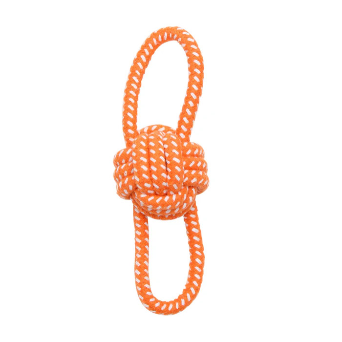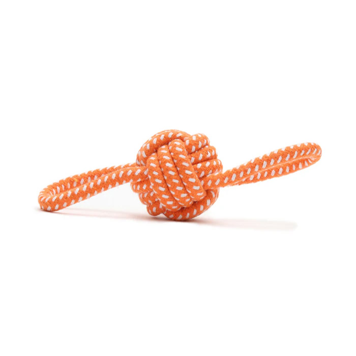 「ノッティー ボール2」は、明るいオレンジ色のロープで編まれたボールの両端にそれぞれ輪が繋がっています。丈夫に編まれているので、噛む・引っ張る・追いかける等、楽しく遊ぶことができ、しっかり噛めるので、ストレス解消やデンタルケアにもってこいです。