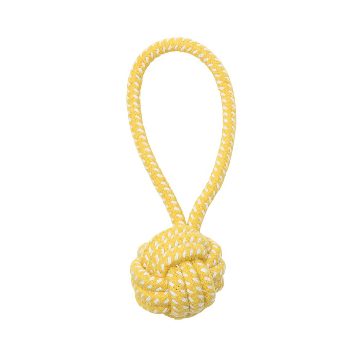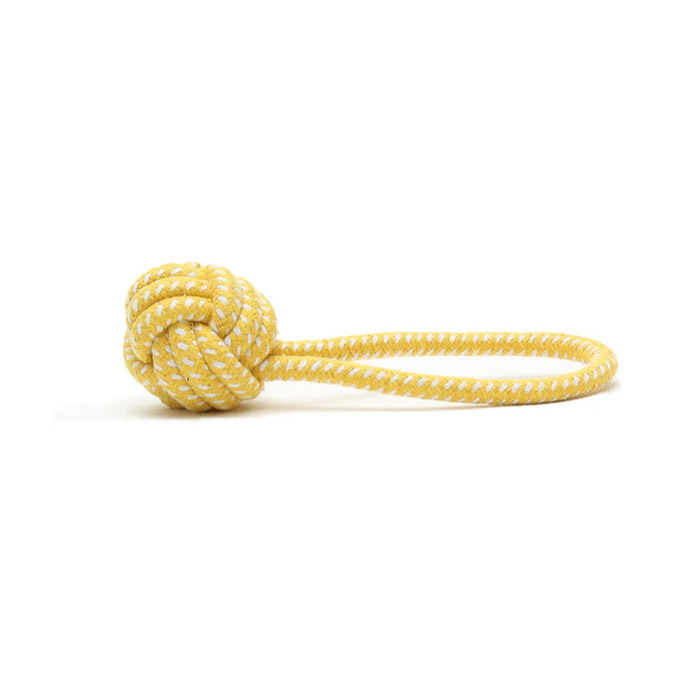 「ノッティー ボール1」は、明るい黄色のロープで編まれたボールに輪が繋がっています。丈夫に編まれているので、噛む・引っ張る・追いかける等、楽しく遊ぶことができ、しっかり噛めるので、ストレス解消やデンタルケアにもってこいです。
