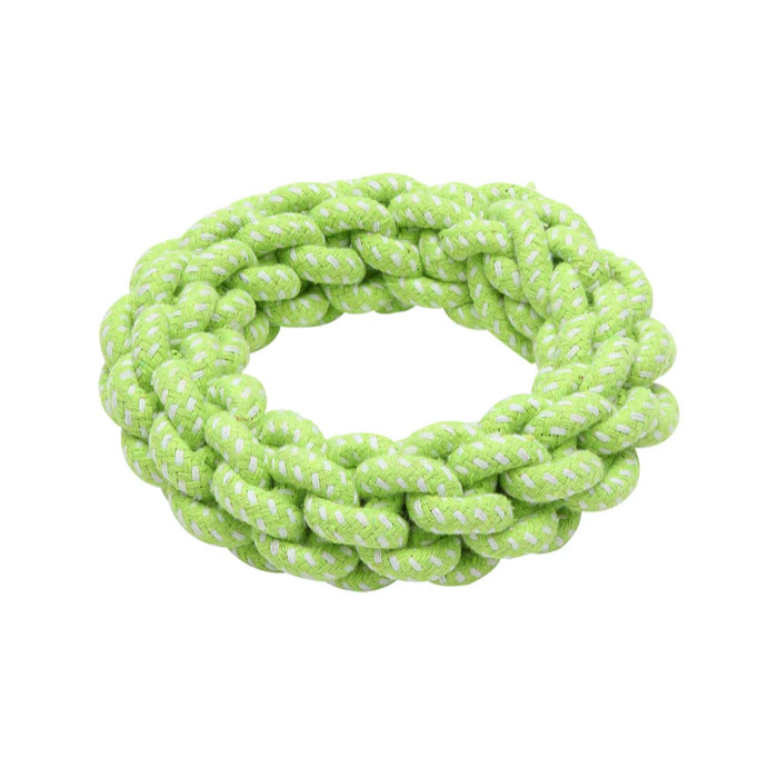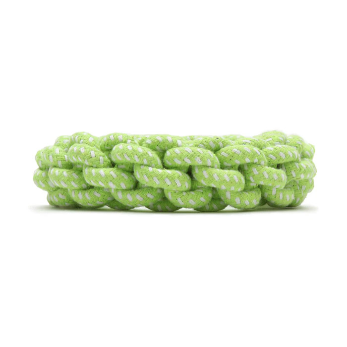 「ノッティー ビッグリング」は、明るいグリーンのロープをドーナツ状に編んであります。噛む・引っ張る・追いかける等、楽しく遊ぶことができ、しっかり噛めるので、ストレス解消やデンタルケアにもってこいです。引っ張るとしなやかに伸びる程度の硬さに編んであるので、小型犬やシニア犬でもお使いいただけます。