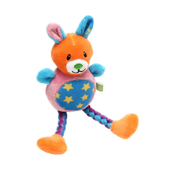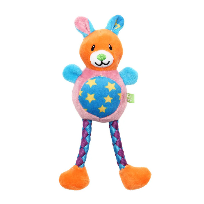 「バブー メロディー」は、目に鮮やかなビタミンカラーのクマ型ぬいぐるみにスクウィーカーが入っています。足はTシャツ生地を編んだロープになっています。柔らかいおもちゃが好きなワンちゃんにおすすめです。
