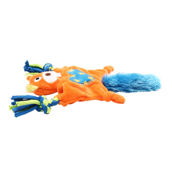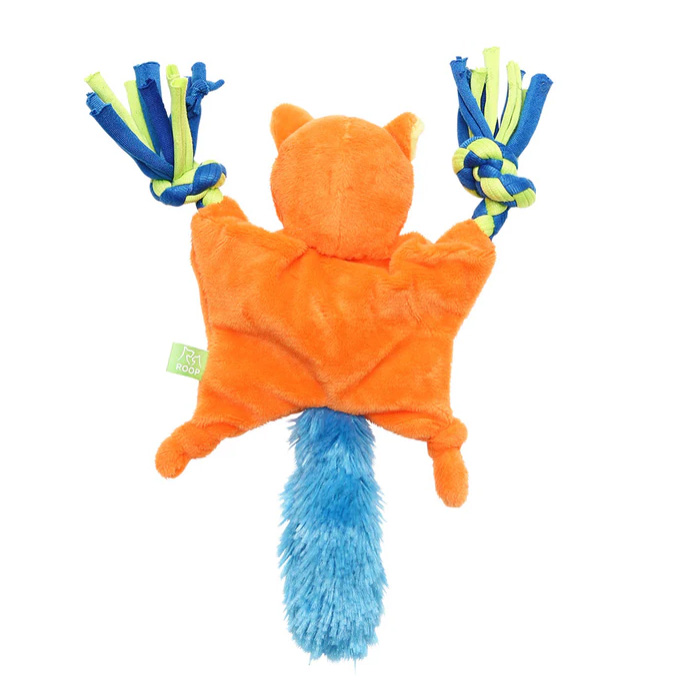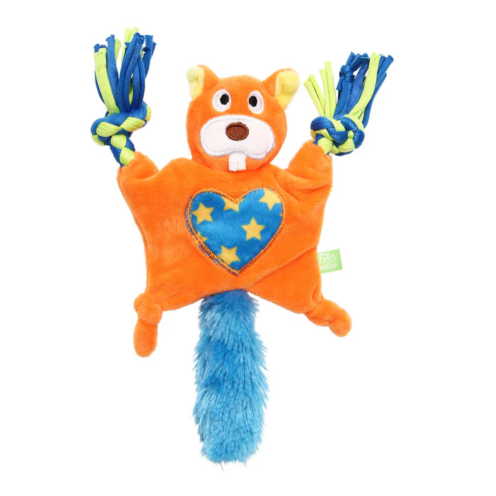「バブー レプル」は、目に鮮やかなビタミンオレンジのモモンガ型ぬいぐるみにスクウィーカーが入っています。ボディはカサカサ鳴る素材、手はTシャツ生地を編んだロープ、シッポはモフモフの生地になっています。