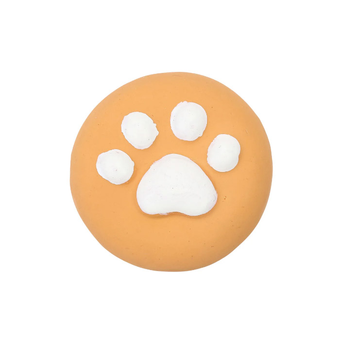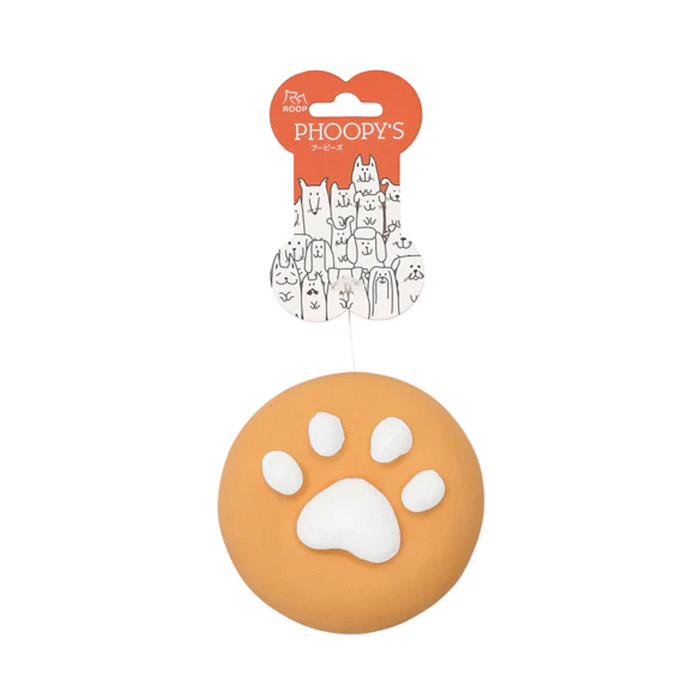 「プーピーズ パウクッキー」は丸型でワンちゃんの足形がプリントされたおもちゃです。柔らかく噛みやすいラテックス製でできています。空気の出入りでプープーと楽しい高音が出ます。