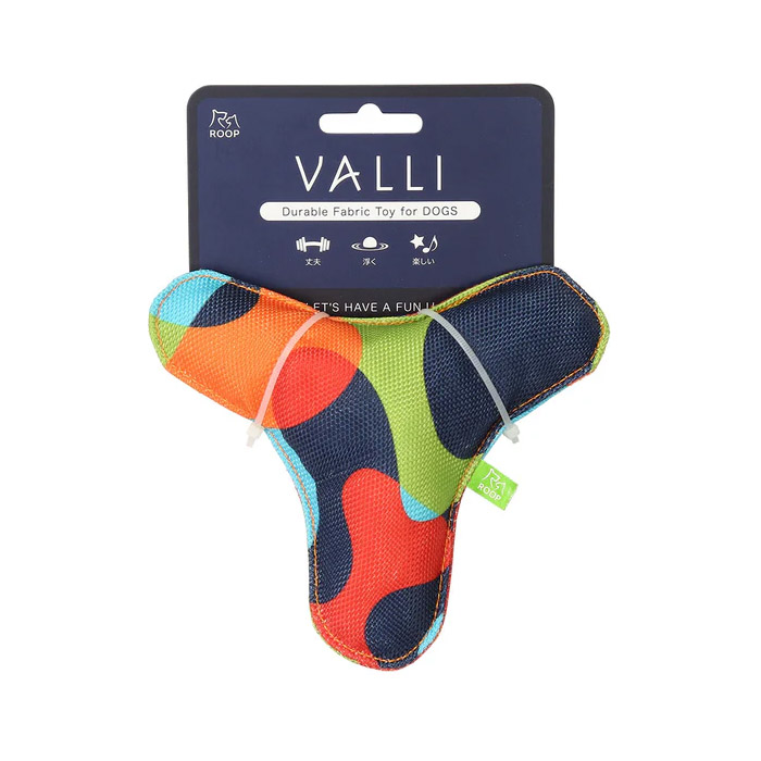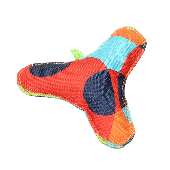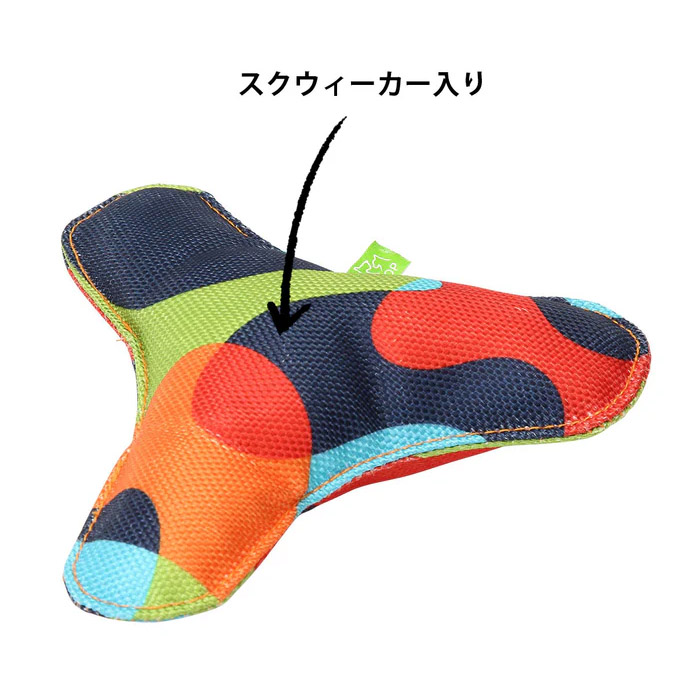 高密度に織られた丈夫なナイロンで作った、ブーメラン型の犬用おもちゃです。プラチック製よりも口や鼻を傷つけにくく安全です。中央にスクウィーカーが入っていて、キュッキュッと音も鳴り、ワンちゃんの本能を刺激します。 室内・屋外はもちろん水辺でも、毎日楽しく遊ぶことのできるおもちゃです。