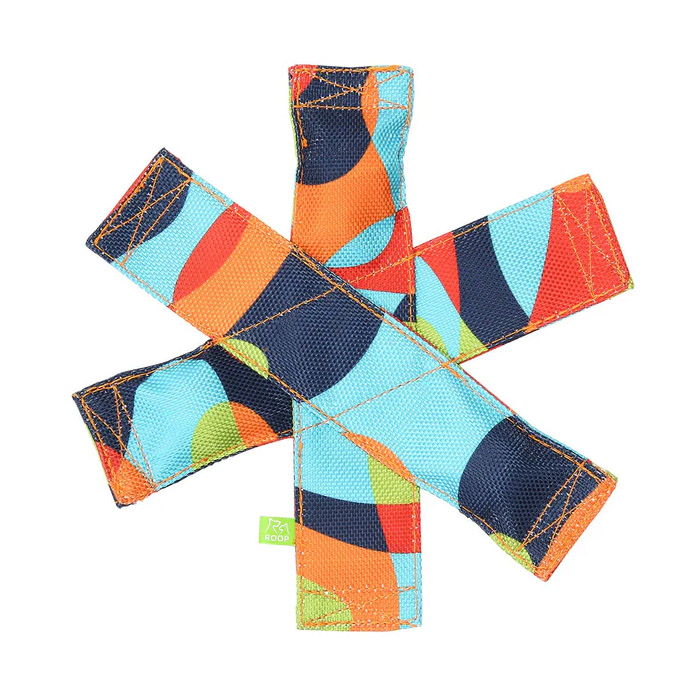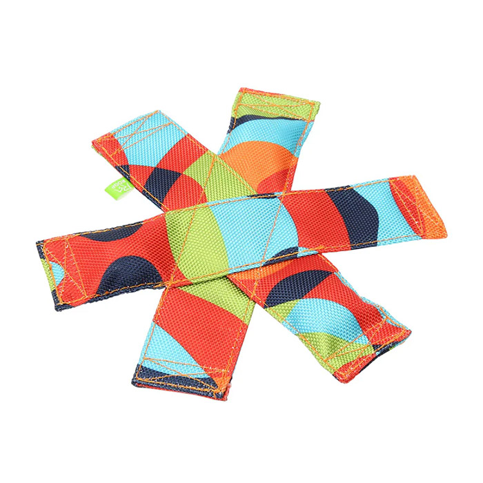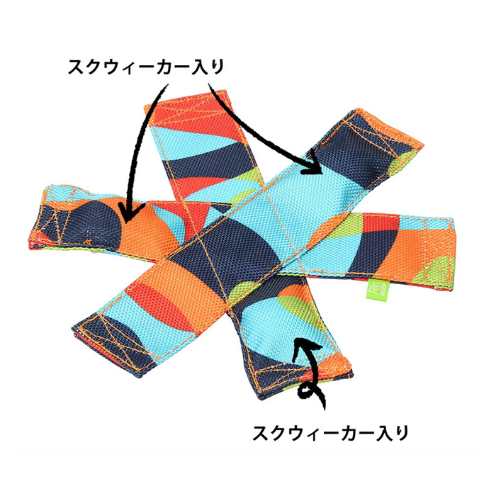 高密度に織られた丈夫なナイロンで作った、三本の短冊をフリスビー型に縫い合わせた犬用おもちゃです。プラチック製よりも口や鼻を傷つけにくく安全です。3ヶ所にスクウィーカーが入っていて、キュッキュッと音も鳴り、ワンちゃんの本能を刺激します。 折りたたむこともできるので、使わないときはポケットやポーチに入れることもでき、持ち運びにも便利です。