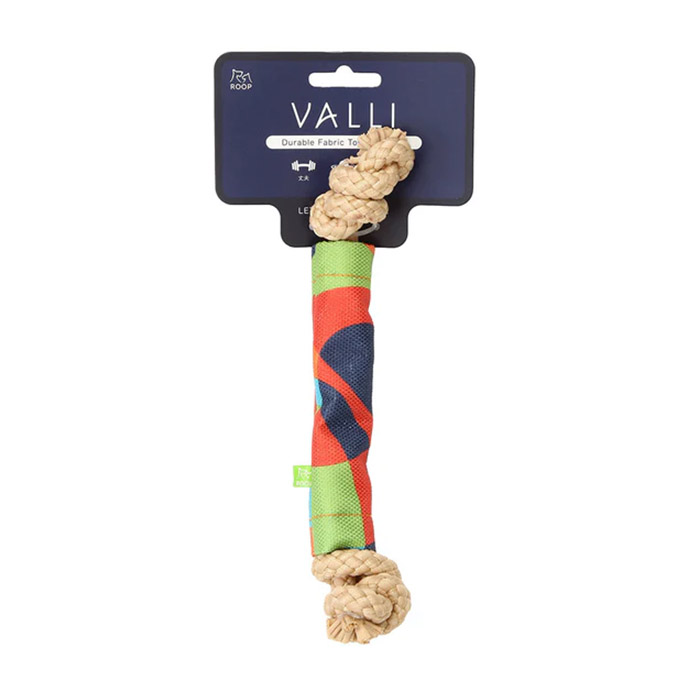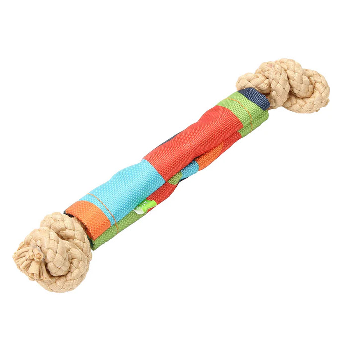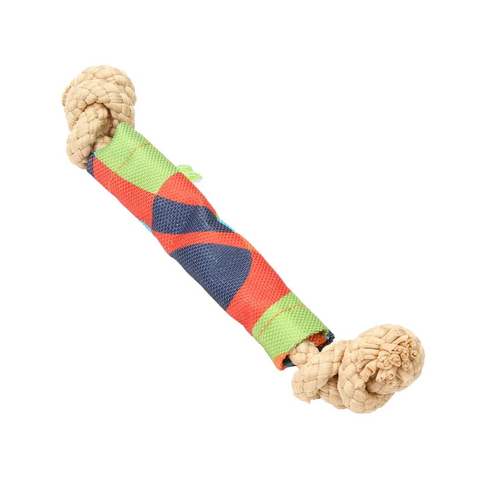 高密度に織られた丈夫なナイロン生地とTシャツロープが組み合わさった犬用ロープ型おもちゃです。プラチック製おもちゃよりも口や鼻を傷つけにくく安全です。生地とロープの2種類の噛み心地を楽しめます。 噛んだり引っぱたりするのが大好きなワンちゃんにおすすめの一品です。