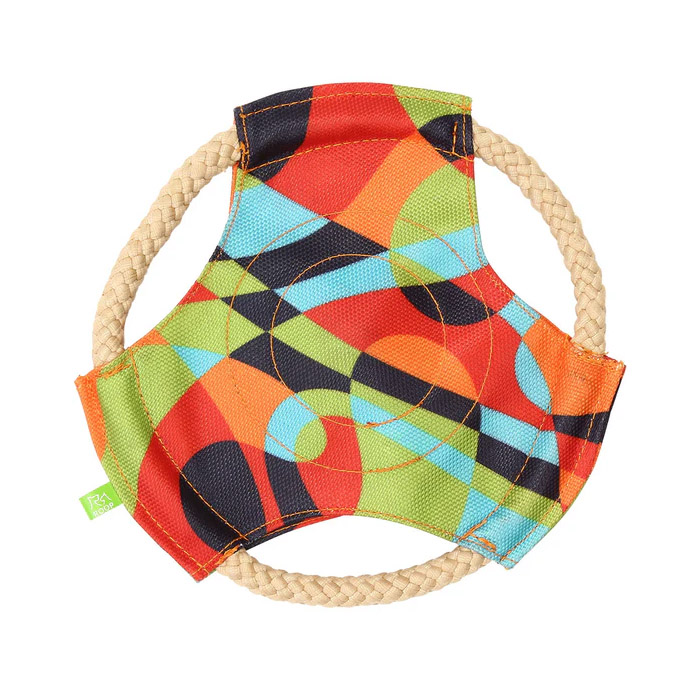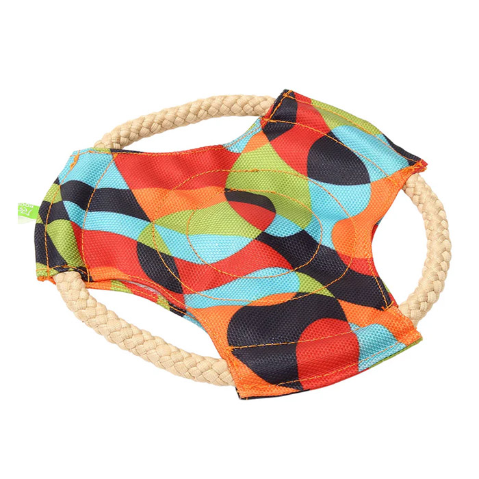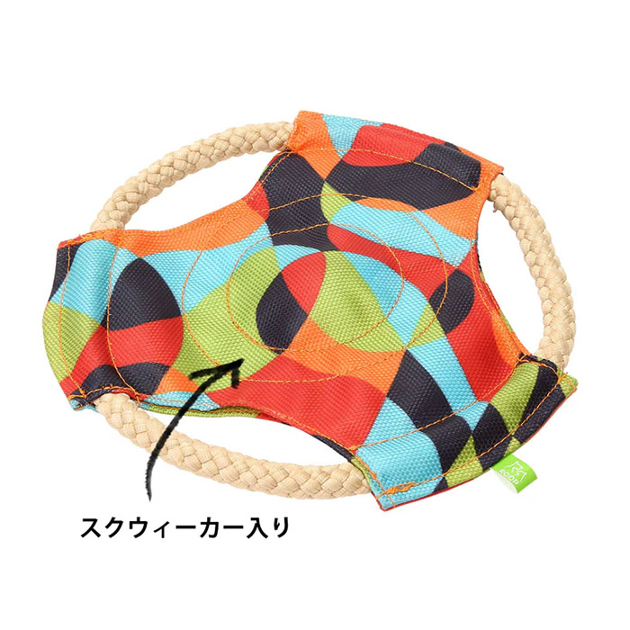 高密度に織られた丈夫なナイロンで作った、フリスビー型犬用おもちゃです。プラチック製よりも口や鼻を傷つけにくく安全です。中央にスクウィーカーが入っていて、キュッキュッと音も鳴り、ワンちゃんの本能を刺激します。 フレームにはTシャツロープが使われていて、引っぱり遊びも楽しめます。