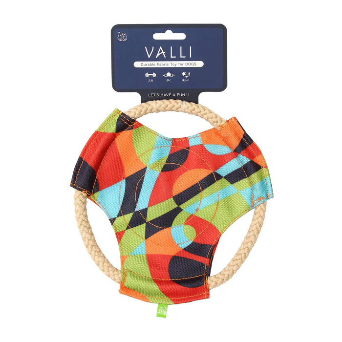 ROOP VALLI(ループ ヴァリー)に使われている布地は、一般的なナイロン生地(420デニール)よりもやや厚めの600デニールと、高密度の1680デニールの非常に高い強度をもったナイロンです。これらを2枚重ねて縫製することにより、よりタフな作りになっています。丈夫でありながら、軽くて水に浮くので、水遊びにも適しています。色々な遊び方ができますので、しつけや知育遊びにもお役立てください。
