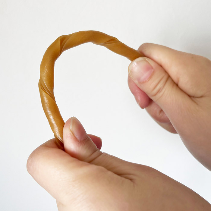 ・やわらかいシート状のガムを、ねじって食べやすいスティック型に。