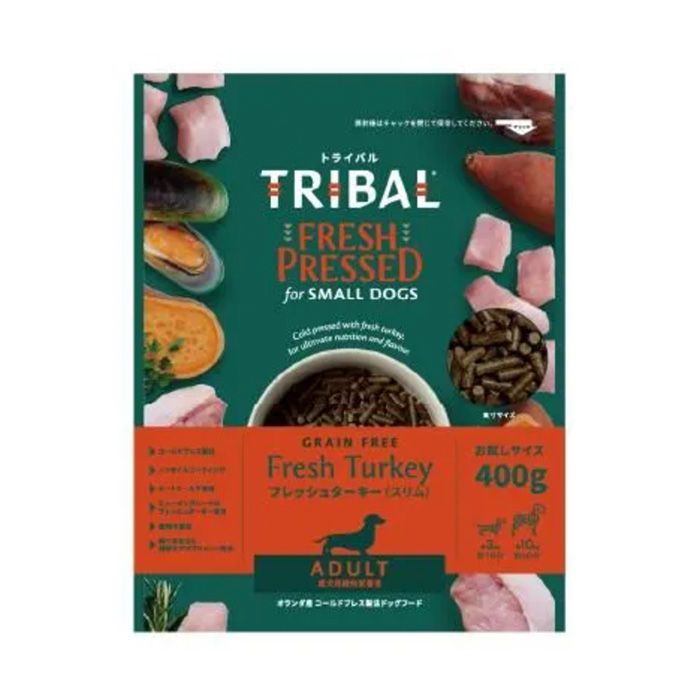 一般的なドッグフード(エクストルーダーのキブル)は200度近い高温で製造されます。 高温で加熱された肉(タンパク質)類は、栄養素や本来の美味しさが損なわれ、さらには熱で硬くなったキブルが愛犬の消化に負担を与えます。 トライバルのコールドプレス製法は100度以下の低温で製造されます。 そのため素材本来の栄養素や酵素をできる限り残し、肉本来の味と美味しさを閉じ込めました。 また、使用されている肉類は全てヒューマングレードのフレッシュミート(ミートミール不使用)で優れたタンパク源を愛犬へそのまま与えることが可能です。 【フレッシュミートのみを使用】 トライバルの肉類はフレッシュミートのみを使用しています。 一般的なドッグフード(エクストルーダー製法)ではタンパク質の含有量を増やすため、200度以上の高温で加工されたミートミールを使用しています。 そして、ミートミールを含む原材料をさらに高温で加工し、ドッグフードのキブルへ成型(エクストルーダー)します。 トライバルの特徴は、高温加工を繰り返すことによる栄養素への影響を考え、生肉のみを使用していることです。 【トライバルに使われている主な原材料】 ◆フレッシュターキー トライバルの七面鳥は自然に近い環境で放し飼いで育った肉質・栄養素共に最高品質です。さらに低脂肪、低カロリーでビタミン&ミネラル(鉄分やセレン、亜鉛等)を豊富に含みます。 ◆スイートポテト スイートポテトは食物繊維やビタミンA、C、B6や天然ミネラルが豊富に含まれます。 ◆加水分解タラ 消化吸収に優れ、高タンパクでビタミンやミネラルの含有量もバランスが良いのが特長です。 ◆全卵 全卵は食物繊維とビタミンCをのぞくすべての栄養素を含みます。 また、最高のタンパク質源でもあり、バランスの良いアミノ酸も特筆すべきものです。 ◆サーモンオイル オメガ3脂肪酸が豊富なサーモンオイルは食欲増進や被毛の艶向上、また関節ケアや皮膚トラブルなど、その効果は多様です。 嗜好性が高く、消化吸収に優れ、犬のエネルギー源となるチキンファットは、必須脂肪酸のオメガ3、オメガ6も摂取することができます。 ◆緑イ貝 グルコサミンやコンドロイチンといったサプリメントで有名な成分を豊富に含み、関節ケアに効果的と言われています。 また、トライバルにはさらにサプリメントでグルコサミンとコンドロイチンを配合し、近年増加している関節に問題を抱える愛犬に向け、より最適なレシピとなります。 <<ハーブブレンド>> ●パセリ:フラボノイド、抗酸化物質、およびビタミンが豊富です。 ●ローズマリー:鉄分、カルシウムとビタミンB6が含まれています。また、抗酸化物質としても作用するとされています。 ●イラクサ:優れた植物性栄養素を持ち、繊維質が豊富に含まれます。 ●カモミール:消化機能に鎮静効果をもたらし、消化不良を和らげる効果に期待できます。 ●セージ:ビタミンA、E、Kやミネラルを含み、便秘時にお腹の張りを和らげるのに作用すると言われています。 ●タイム:ビタミンA、C、K、鉄、マンガンとカルシウムが豊富に含まれています。 ●コリアンダーの葉:日本では「パクチー」として有名ですが、その栄養素も注目されています。 ●タンポポの葉:消化器官の働きをサポートするとされ、日本でも食用として人気があります。 ●カンゾウ:漢方薬としても有名で、消化器官の粘膜保護作用に効果的です。 【他のフードからトライバルへの切り替え方法】 コールドプレスフードと一般的なエクストルーダーフードは消化のプロセスが異なります。 フードをトライバルに移行する際は、以下をご参照ください。 ※消化不良を起こしやすい場合は、移行期間を長くしてください。 <1〜3日目> トライバルをトリーツとして与えます。最初は少なめで与え、3日間で徐々に量を増やしていきます。 また、体重管理の必要な愛犬の場合、旧フードの給与量を減らしてください。 <4〜6日目> トライバルを1回目(朝食)に与え、2回目の食事は旧フードを与えてください。 <7日目> 完全にトライバルに切り替えてください。 |