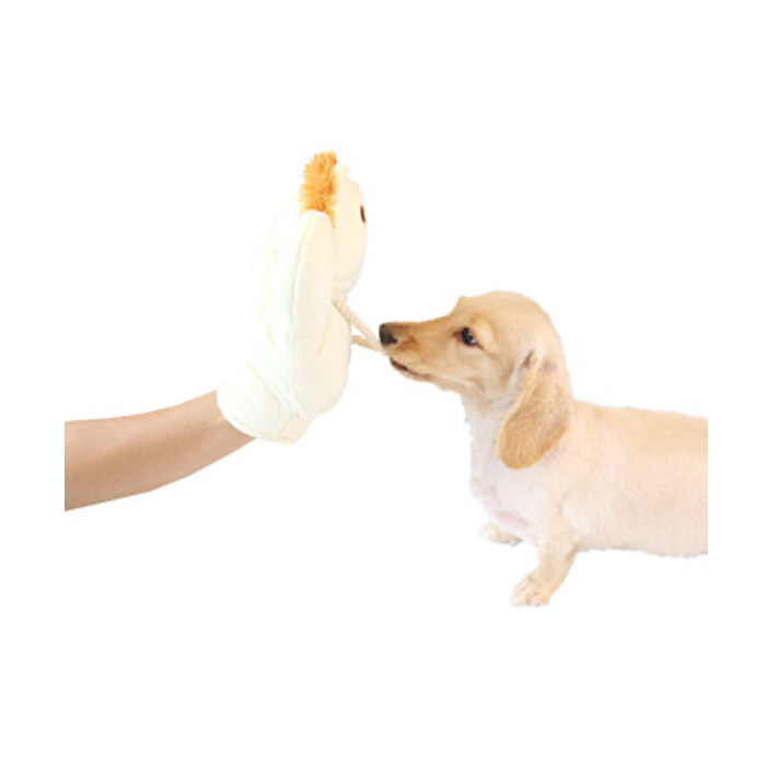 | におわせたり揺らしたりしてわんちゃんの興味を引き、ロープをひっぱったりして、コミュニケーションを取りながら遊んでください。使用前に内側の先端の生地を奥まで差し込み指になじませてください。 |