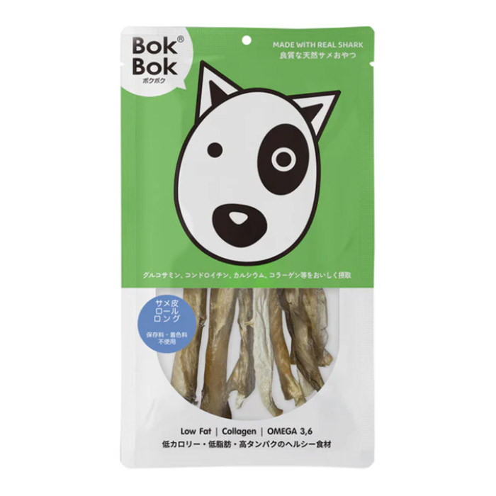 BokBok(ボクボク)は、サメを主原材料に使用した、タイランド産の犬用サメおやつです。サメ肉は低カロリー、低脂質、高タンパク質で、サメ軟骨は健康をサポートする成分がたっぷり含まれており、人間用サプリメントが注目されているのと同様、幼犬から老犬、幼猫から老猫まで幅広い世代に適した食材です。