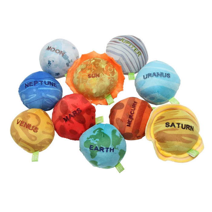 「プラネット」シリーズは、正面に星の英語名が刺繍してあり、中にはスクウィーカーが入っています。