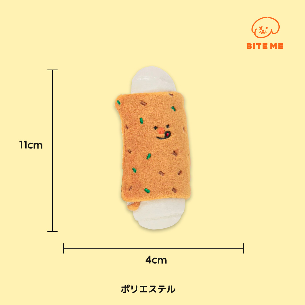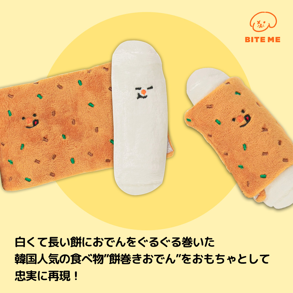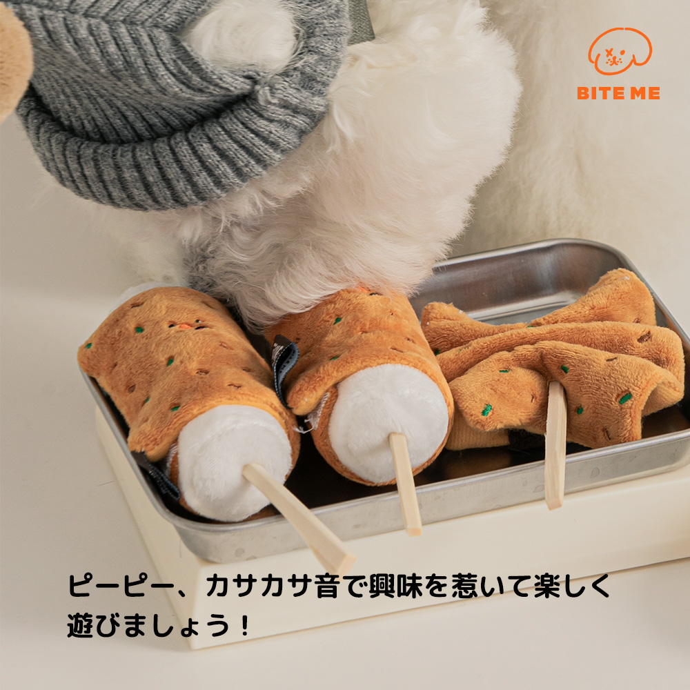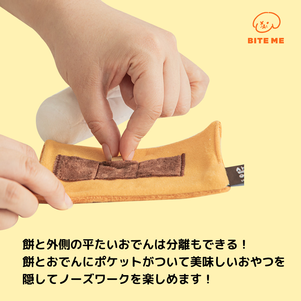 もちもちした餅を包んだおでん! 巻いてある練り物はカシャカシャ音が鳴り、おやつを隠すスペースもあります。 ピーピー音のなる餅にもポケットがあるので、 おやつを隠してノーズワークを楽しんでください!